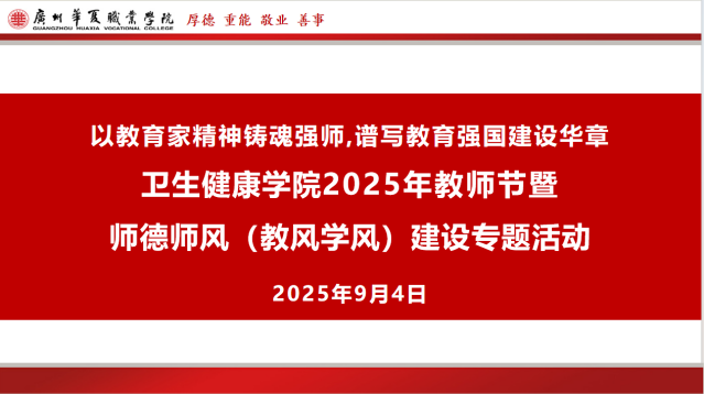 党总支书记张晓君以今年教师节主题“以教育家精神铸魂强师,谱写教育强国建设华章”,作《卫生健康学院2025年师德师风(教风学风)建设专题报告》,带领全体教职工深入学习了《教职员工仪容仪表及言行规范倡议书》《广州华夏职业学院教师与学生课堂规范》《广州华夏职业学院教师职业行为细则(修订)》及《关于弘扬教育家精神加强新时代高素质专业化教师队伍建设的意见》等文件,并从践行教育家精神、严守规范底线、深化教风学风协同三个方面明确了师德师风建设的重点任务,为教师的日常教学与言行举止提供了方向指引。